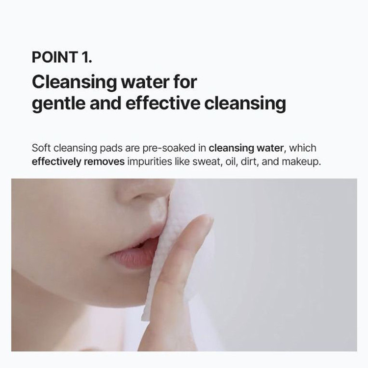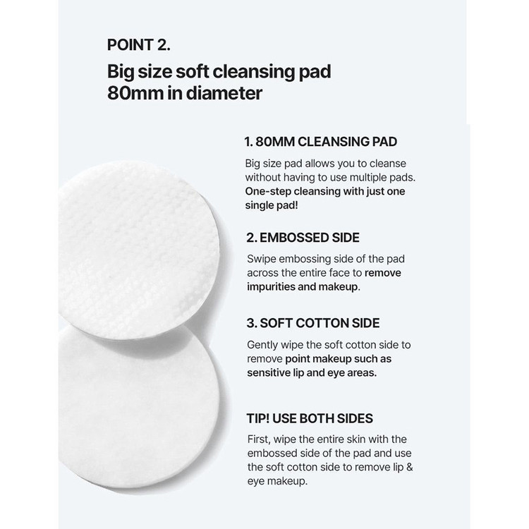 یک سمت برجسته (Embossed) برای پاک کردن آرایش و آلودگی های سطحی، و سمت دیگر پنبه ای نرم (Soft Cotton) برای پاک کردن نواحی حساس مانند لب و دور چشم