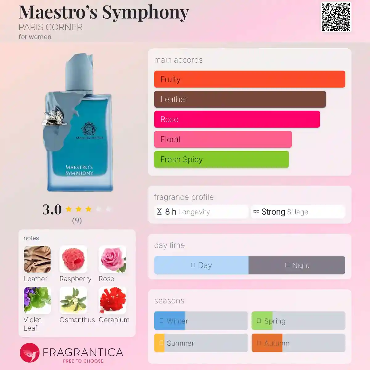 ادکلن Paris Corner Maestro’s Symphony عطری است برای کسانی که میخواهند رایحهای متفاوت، هنری و چندوجهی داشته باشند. ترکیب میوههای شیرین، گلهای لطیف و چرم گرم، این ادکلن را به گزینهای عالی برای استفاده روزانه، قرارهای دوستانه و محیطهای رسمی تبدیل میکند.